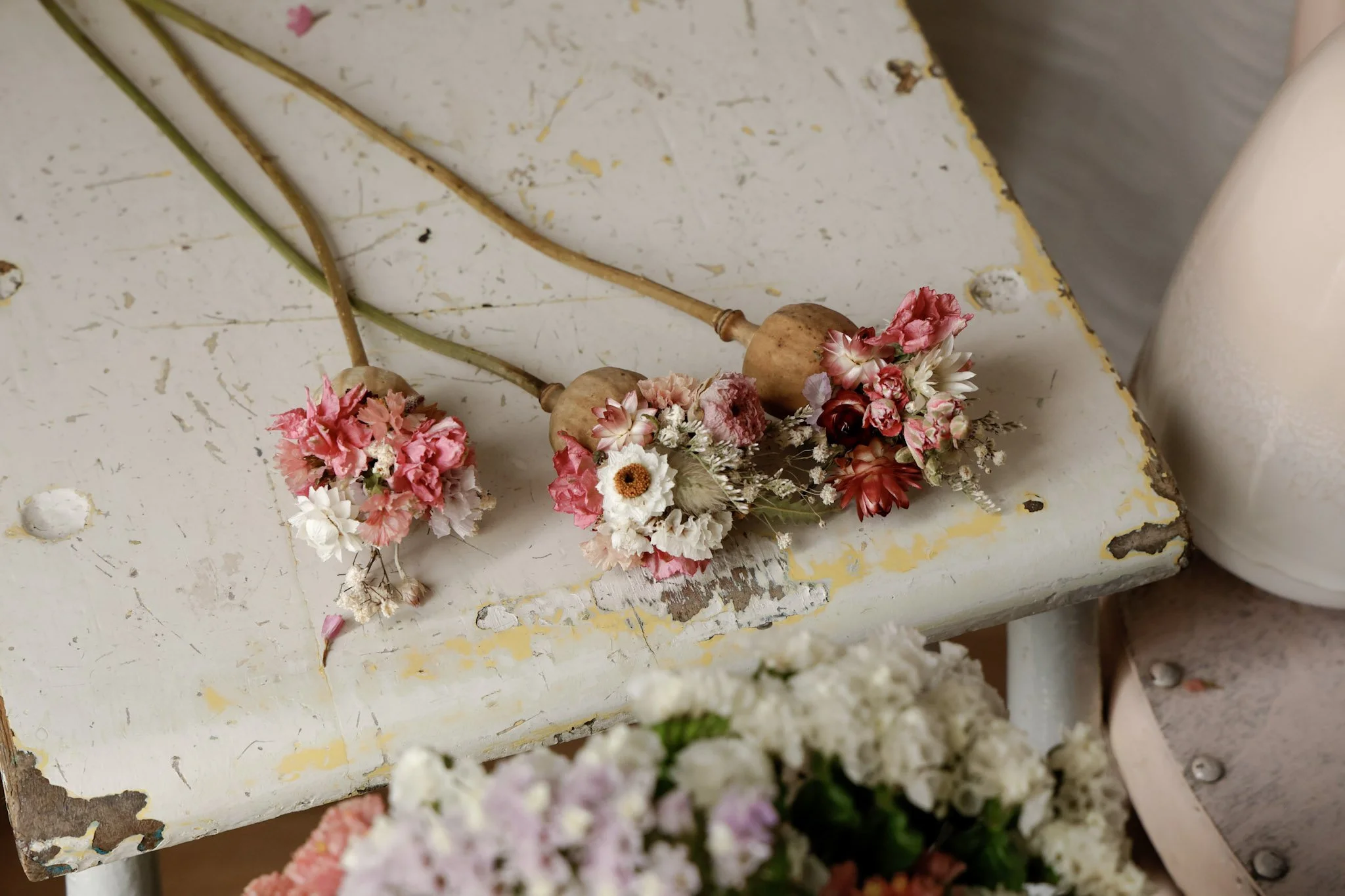 Each Poppy Fleur is made from a naturally dried poppy pod, carefully filled with everlasting sprigs and botanical elements — all grown, foraged, or locally sourced, then naturally air-dried without dyes or chemicals.