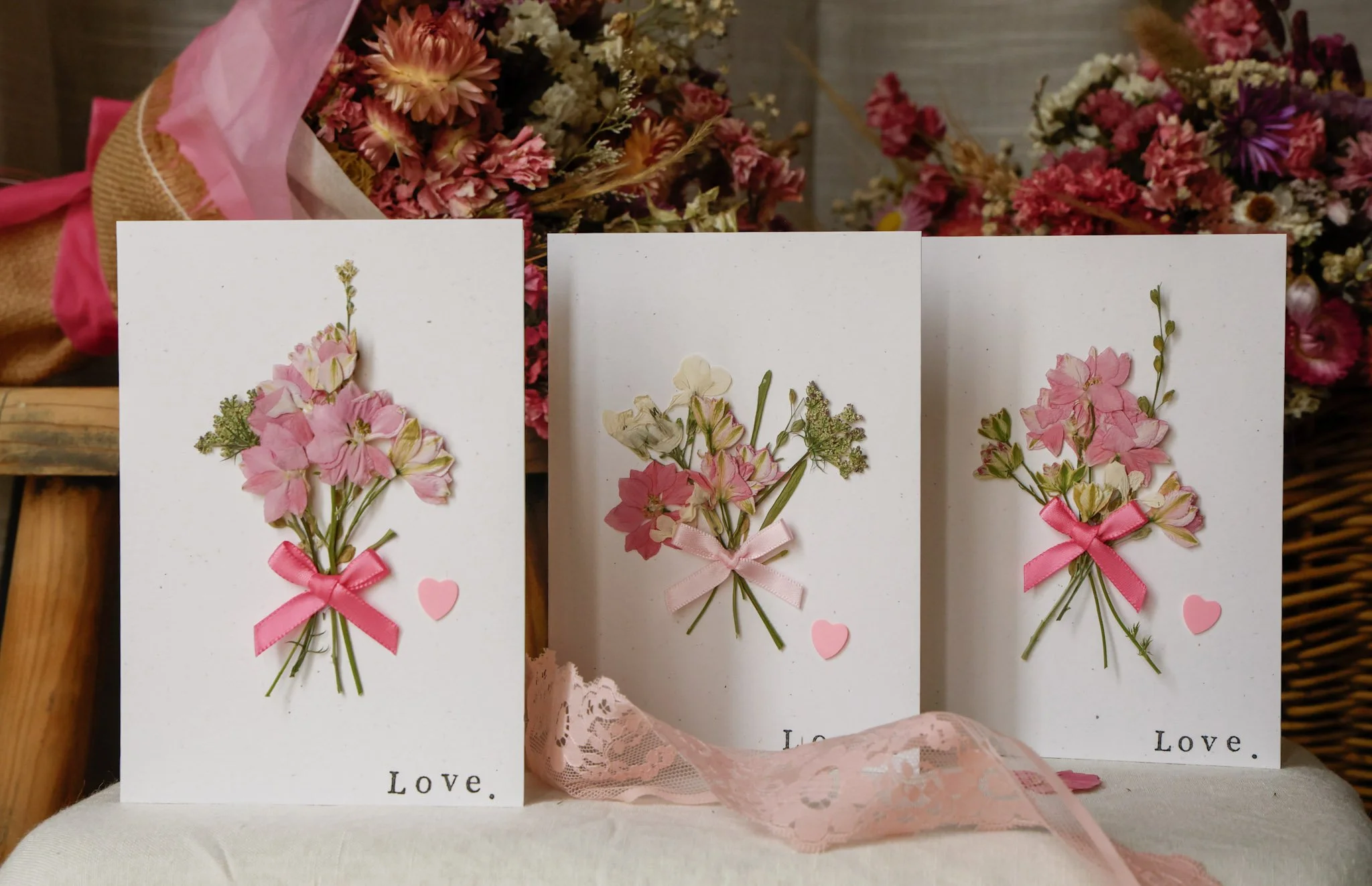 Finished with a soft light or hot pink satin bow, a small heart embellishment, and the word LOVE hand-stamped in the front right-hand corner, each card is a gentle expression of care and affection.